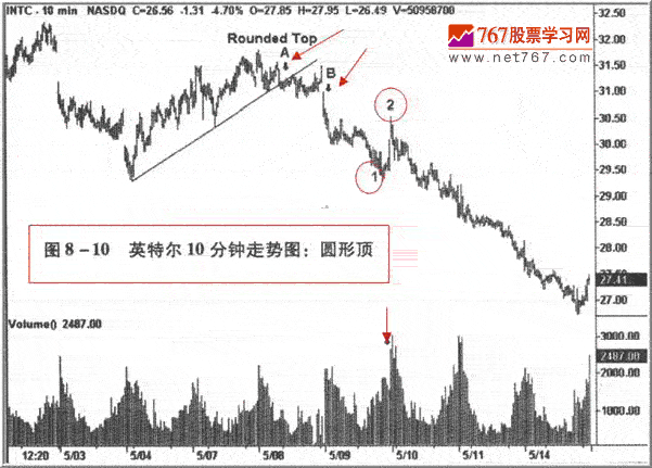 碟形反转排列比较容易察觉,因为其形成过程很缓慢,让你有足够的时间慢慢琢磨。请参考图 8-10 ,整个盘头过程大约花了两天的时间。股价创高点之后,稍微回档,然后又反弹,劲道仍然十足,但无法穿越先前的高点。在 A 点,当价格跌破上升趋势线时,可以考虑放空,但也可以等到 B 点位置,股价大跌显示上升趋势已经结束。