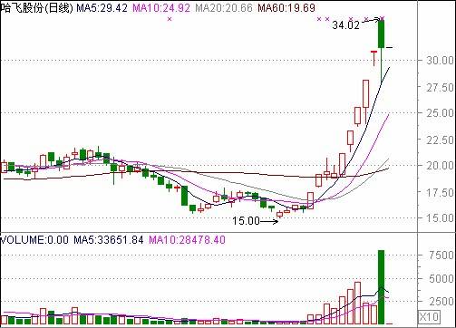 新疆塔里木农业综合开发股份有限公司系经新疆生产建设兵团于1998年4月20日以新兵函[1998]17号文批准,由新疆阿克苏农垦农工商联合总公司独家发起,并经中国证监会以《关于核准新疆塔里木农业综合开发股份有限公司公开发行股票的通知》核准采用社会募集方式设立的股份有限公司。公司股份总额为29400万股,1999年4月在上海证券交易所上市。2001年经中国证监会以《关于核准新疆塔里木农业综合开发股份有限公司配股的通知》核准,向社会公众股股东配售2700万股,股份总额变更为32100万股。公司所属行业为种植业类。 公司经营范围:农业种植,牧渔养殖,农产品、畜产品的生产加工及销售,农业机械制造及修理,塑料制品、皮革制品的销售,自营和代理各类商品和技术进出口业务,棉纺织品的生产、销售。公司经营的主要产品为棉花。 哈飞股份 哈飞股份(600038)流通A股:1.68亿,在16元开始启动,11个交易日涨幅达86%(图2.9)。