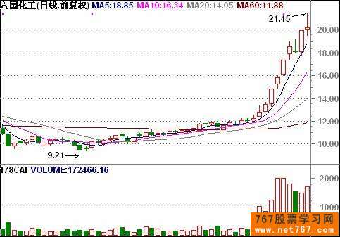 六国化工(600470)流通A股:1.45亿,在12元左右开始启动,10个交易日涨幅达56%(图2.10)。 图2.10 |