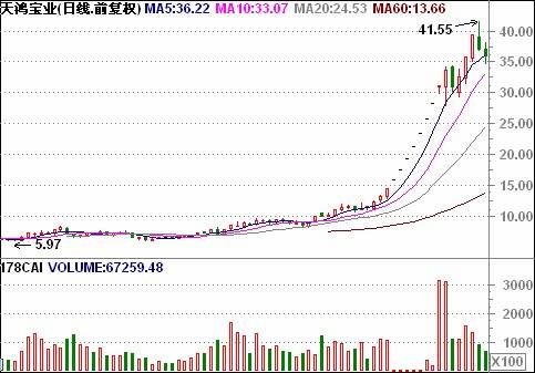 天鸿宝业(600376)流通A股1.46亿,在10元左右开始启动,17个交易日涨幅达225%(图2.11)。 图2.11 |