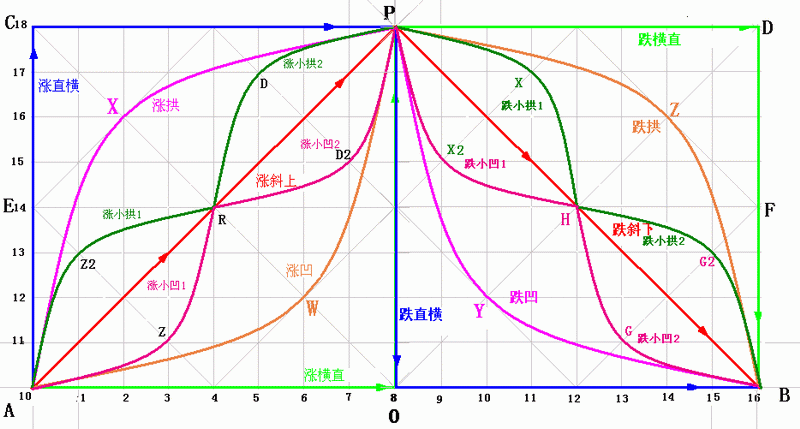 图290-4 我们把五种基本涨势和五种基本跌势组合到一张图上,就是“股价涨跌五势及其改良的走势图”(图290-4)。一个股价很可能沿着一种涨势上升,再沿着另外一种跌势下跌,不管怎么走,基本跑不出去这五种基本涨跌走势。比如说从A经过涨凹的W线路,从建仓的缓慢上涨到拉升的快速上涨,涨到P点作头,然后经过跌拱的Z线路下跌,从头部出货缓慢下跌,跌到出货结束的快速下跌,然后下跌到B点,完成一轮涨跌走势。当然我是举例说明,这只是一种走势,实际每个股票都是在基本形态中走出千变万化的形态。 学生:股市涨跌五势及其改良的走势图,远看像一幅地图。 老师:是的,这是股市的地图,进入股市如果没有这张地图,可能会迷失方向,走很多弯路,被碰得头破血流,最后只好问路或买地图。以后我们要讲的许多股价走势,其原理都出自此图。特别是实战的精典图形及其最佳买入点与最佳卖出点的设计,其原理也都出自此图。 |