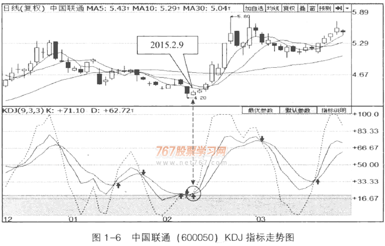 与其他技术指标相似,寻找股票的最佳买卖点也是KDJ指标最主要的作用之一。由于KDJ指标具有出众的灵敏性,常常被用作寻找短线尤其是超短线买卖点的最佳帮手。 当然,因为KDJ指标过于灵敏,常常会发出一些无效的信号。交易者必须学会从众多无效信号中找到那些有价值的交易信号。 1.买入信号识别 KDJ指标发出买入信号的形式主要包括:黄金交叉、超卖区曲线K转向、曲线K自超卖区返回常规波动区间等。 如图1-6所示,中国联通的股价自2015年1月中旬启动了一波震荡下跌走势,KDJ指标也随着股价的震荡逐步走低。2月初,曲线K进入超卖区间,这意味着股价即将出现反弹向上的走势。
