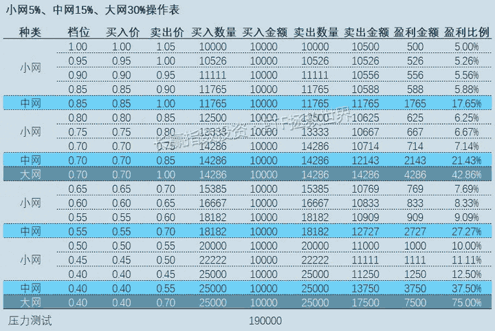 一、网格 1.0 的问题 上次让各位先自行思考网格 1.0 的问题。大家可以再看下面两张图,那么 1.0 的问题到底有哪些呢? 很明显,最大的问题在于——在一波强势上涨中,赚得不够多。大家看 2015 年底到 2016 年底这一波接近 80% 的暴涨中,你的每一格投入只赚了 5%~8%。没错,你的所有投入都赚钱了,之后的下跌你也全都躲过了,但是 99.9999% 的人都会极度不满意自己的这波操作。尤其是当这个品种从 0.4 涨到接近 0.8,你看着交易记录中自己在最低位买入的居然只赚了 7% 就卖掉了,一定悔恨不已。 然而如果你足够理性,你就应该知道——悔恨毫无用处,没有时光机器让你回到几个月前再来一次。所以你最应该做的,是改进你的交易策略,下次做得更好。 赚少了,没关系,我们升级。 我们的网格策略2.0,是由若干子策略集合而成。你可以组合使用,也可以单独使用。丰俭由人,各取所需。 二、2.1:留利润 2.0 的第一个子策略,叫做留利润。 每一次网格卖出操作中,你可以把利润留下。因为这部分是 0 成本,所以你可以无限期持有。 金融心理学告诉我们,人们很容易把持仓品种分为不同的心理账户。那么,我们不如就将这部分 0 成本的利润,做为「免费得到」心理账户的品种,长期持有。无论它如何波动,因为是「赚来的」,所以在正常人的认知中,它都不会带来情绪化上的变化。 各位要知道,由于经济发展以及通胀的影响,绝大多数指数型品种长期看都会一路向上。所以你的网格利润自动转换成长期持有的部分后,会为你带来长期良好收益。 留利润子策略具体做法: 举例,1 元价格买入 10000 元某品种 10000 份。1.05 元卖出 10000 元 9524 份,剩下的 476 份永不卖出,或者到极度高估的情况再卖。 这个子策略,你还可以继续进化。比如:留双份利润,留三份利润。怎么理解?你一格赚了 5%,但因为这时候已经跌得太多了,你可以不仅留下 5% 的利润,还可以留下 5% 甚至 10% 的本金。 即,1元价格买入 10000 元某品种 10000 份。1.05 元留双份利润,卖出 9048 份 共 9500 元,500 元利润与 500 元本金永不卖出,或者极度高估才卖。 三、2.2:逐格加码 这个很容易理解。 只要一个品种不会死,一定是价格越低价值越大。同时,见底以及波动的可能性也逐渐增加。所以,每一格增加一定投入,最终可以获取更大的利润。这也一定程度上缓解了 1.0 系统中底部利润过低的缺陷。 怎么加呢,永远要牢记压力测试的重要性。 列表格,列出最坏情况下自己是否还能坚持。然后逐渐加码,你可以尝试从第二格开始,每格比上一格加 5%。算到最后你发现自己资金和心理状态扛不住了,没关系,那就从第三格开始加码,前两格用同样的金额。如果还是扛不住,那就从第四格开始。 如果你发现到最后自己的状态也非常轻松,那就每格增加 7%,或者 10%。总而言之,因为所有交易在交易开始前你就已经开始计划,所以无论如何调整都没有任何问题。只要你不过高或者过低估计自己的实际情况,那么怎么调整细节是非常自由的。 四、2.3:一网打尽 这是网格 2.0 系统的终极大招,会让利润疯狂奔跑的子策略。 各位可以想象一下,自己是出海打鱼的渔夫。这时候你需要面临选择:如果你带的网很密,那你会把所有小鱼抓走。但这样做的问题在于,你把所有小鱼苗都抓走了,它们永远也无法长成大鱼让你吃大肉。然而如果你带的网眼很大,确实能捞到大鱼,但碰到大鱼的机会很低,可能一年也抓不到一只。 那么,发挥你的聪明才智:能不能同时多撒几个网? 好了,2.3 子系统登场。大网,中网,小网一起上。 如果把 5% 的网格当作小网,那么你可以再设置一个 15% 的中网,一个 30% 的大网。把你的资源分配到三个网格系统中。用 5% 的网格满足日常生活所需,15% 的网格改善生活,30% 的网格赚大钱。 什么?你说 30% 不是大钱?朋友,0.3 ÷ 0.7 = 43%。大网第一网就是 43% 的利润,如果你有幸买到第二个大网,那么利润就是 0.3 ÷ 0.4 = 75%。够大不够大? 具体做法: 中网、大网操作方法与小网一致,但网格幅度升至 15% 以及 30%。当然,这两个数字你也可以自己调整,比如 10% 和 20%,又或者 20% 和 40%。无所谓。 中网 0.85、0.7、0.55……买入的,分别在 1、0.85、0.7 卖出。 大网 0.7、0.4 买入的,分别在 1、0.7 卖出。 依然是拿出表格,做压力测试。 有朋友问,为什么大网一网可以赚 43% 和 75%,那么我们干嘛不把所有资源投入到大网上?还要做 5% 的小网? 很简单。未来是未知的。如果整个品种长期只在 10%~20% 的范围内波动,你的大网一网都赚不到,而别人的小网已经赚了很多。记得之前大鱼的例子吗? 这是华宝油气四年来大、中、小网操作示意图。