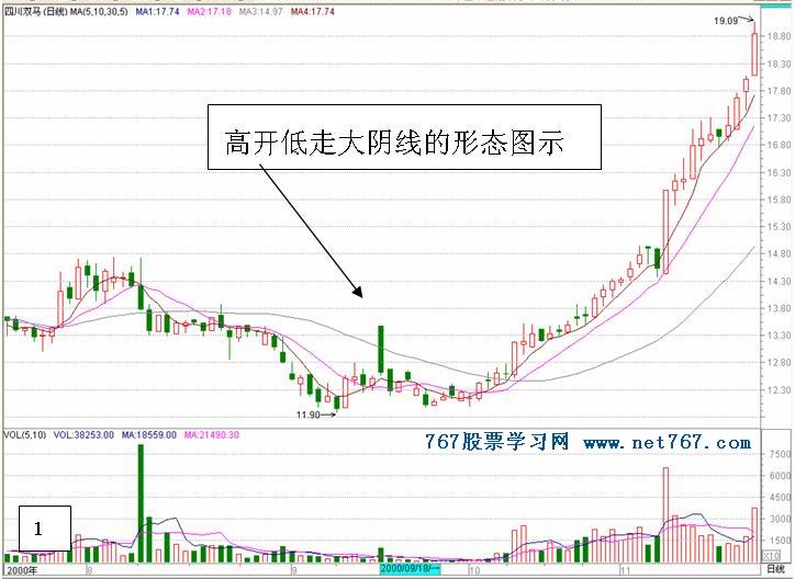 实战市场中,K线组合已经是广为人知和被充分利用作分析和预测的一种重要工具。K线组合一般由两到五根K线组合而成。它对于分析股价的短期走势有着非常重要的作用。而本课则介绍单根K线“高开低走阴线”的使用法则。 “高开低走阴线”的就是开盘的时候股价大幅跳空高开,在开盘后股价并没有再向上攻击,而是出现分时图盘中震荡单边下滑。收盘时其实当天的股价相对昨天的收盘价并没有下跌多少。有部分个股相对昨天的收盘价还是上涨的。但K线上显示是一根高开低走的大阴线。实例形态如:图1 。