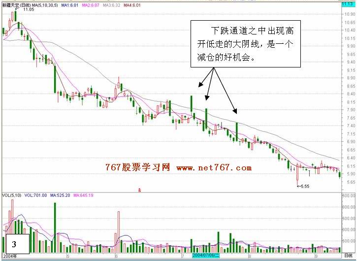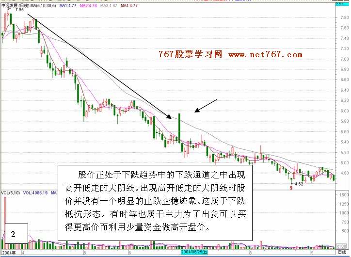 | 高开低走大阴线的 . 位置 . 形态 . 成交量 . 分析与实战应用 上面已经说过了,个股中出现高开低走大阴线主力做开盘价的目的有:拉升之前的试盘;拉升之前的洗盘等等。实盘中在什么位置什么情况之下主力有怎样的目的呢?下面我们通过股价所处位置的划分,成交量的大小等情况来具体问题具体分析和应用。 一. 个股正处于下跌趋势中的下跌通道之中出现高开低走大阴线。这属于下跌抵抗形态,后市看跌。 这类个股出现高开低走的大阴线时股价并没有一个明显的止跌企稳迹象。如图2, 图3