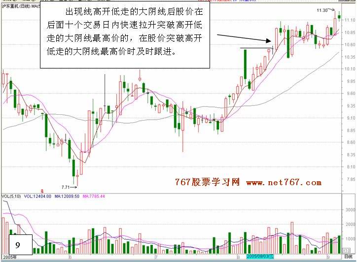 出现线高开低走的大阴线后股价在后面十个交易日内快速拉升突破高开低走的大阴线最高价的,在股价突破高开低走的大阴线最高价时及时跟进。此形态一般为短线行情,操作而快进快出。形态实例如 图9 。