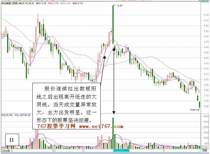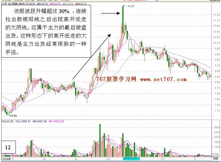 | 一. 个股经过波段比较大的升幅或者在上升通道中出现连续拉出几根阳线后出现高开低走的大阴线。这属于主力减仓出货行为,后市看跌。高开低走的大阴线当天的成交量越大主力出货行为越明显。形态实例 如图11,图12 。